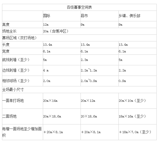 按行業(yè)比賽規(guī)定,整個(gè)球場(chǎng)上空空間 低為9米,在這個(gè)高度以內(nèi),不得有任何橫梁或其它障礙物,球場(chǎng)四周2米以內(nèi)不得有任何障礙物。任何并列的兩個(gè)球場(chǎng)之間, 少應(yīng)有2米的距離。球場(chǎng)四周的墻壁 好為深色,不能有風(fēng)。