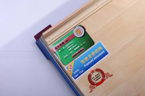 材料選用東北或加拿大楓木。楓木以堅韌度高及級數(shù) 見稱,每條楓木地板尺寸為50-70mm寬,22mm厚,長度由300mm至900mm不等,用特制的魚鉤釘在松木龍骨和膠合板上,其底部附有彈力軟墊,平放在預鋪有防潮膠紙的平整地面上。